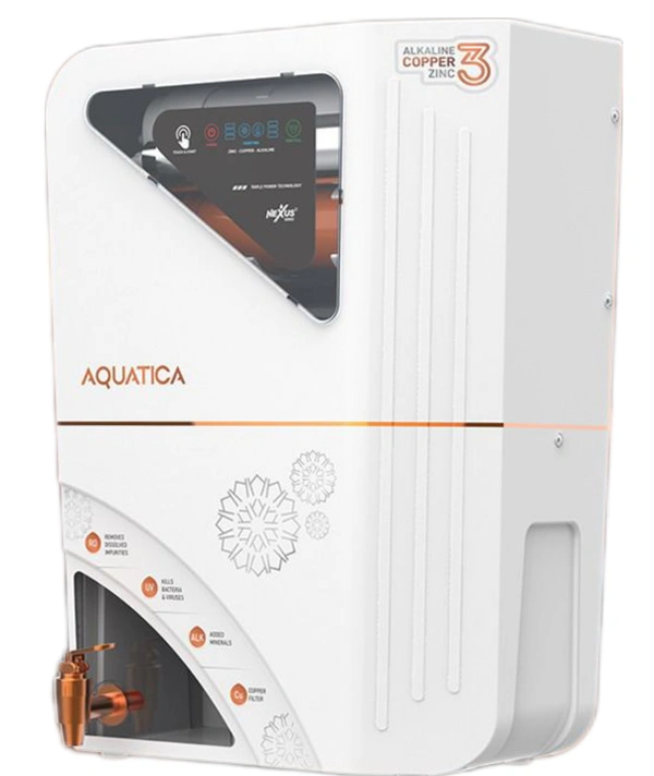Aqua+ICA (Lite) Water Purifier RO UV UF TDS Controller and copper for home and office| Wall Mounted| 10Litre Storage| 12 Litre Filtration Capacity 7 Stage Filtration Aqua+ICA (Lite) Water Purifier Brand: Nexus Aqua+ICA (Lite) Technology: RO + UV+ UF + Copper+ Zinc+Alkaline+ TDS Adjustor Purification Capacity: 12Liter/ Hr Storage Tank Capacity: 10 Liter Filter cartridge: Sediment, Activated Carbon RO Membrane: 80 GPD Booster Pump: 100 GPD UV lamp Power: 11 W Min. Inlet Water Pressure: 0.3Kg/〖cm〗^2 Voltage: 240 V
